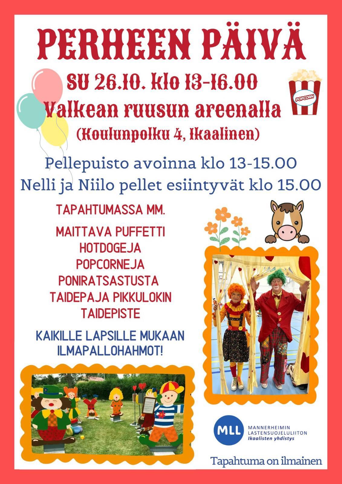 MLL:n Ikaalisten yhdistys järjestää perinteisen Perheen päivä -tapahtuman sunnuntaina 26.10.2025 klo 13.00-16.00 Valkean ruusun areenalla osoitteessa Koulunpolku 4, Ikaalinen. Tervetuloa mukaan koko…